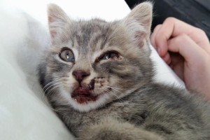 This little girl (6-7 weeks old) was found on 6/13/14 in a daycare parking lot. Her mouth is badly injured, the left side of her face has lacerations and her fur was covered in 100s of fly eggs. We have named her Callie. Dr. Hedrick said it appears Callie was caught in a car engine…