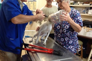 Lexington Police was responding to a call regarding a dog running at large. The dog was darted after not and brought into Davidson Animal to be checked out. During the exam Dr. Hedrick noticed a wound under her collar. Upon removing the collar he found that the injury went all the way around her neck….