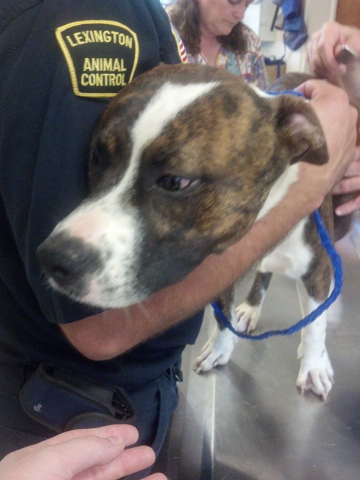 Lexington Animal Control Officer Sam Fritts and LPD Officer Forest was responding to animal welfare call today (8/30/13) when they found 2 male Pit Bulls, chained, starving, and in need of help. Both dogs had no food, no water, and were “living” in horrible conditions. Sullivan (named by Dr. Hedrick) was in the worse shape of the two, he only had about 2 feet of chain to “move” around on and could not stand up without falling down. He is emaciated, severely anemic, and we are hoping he was found in time to be saved.