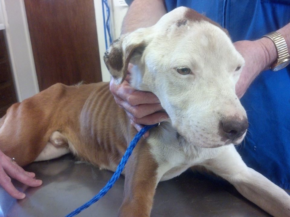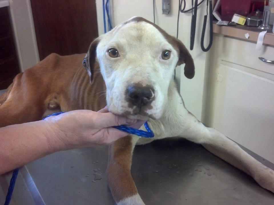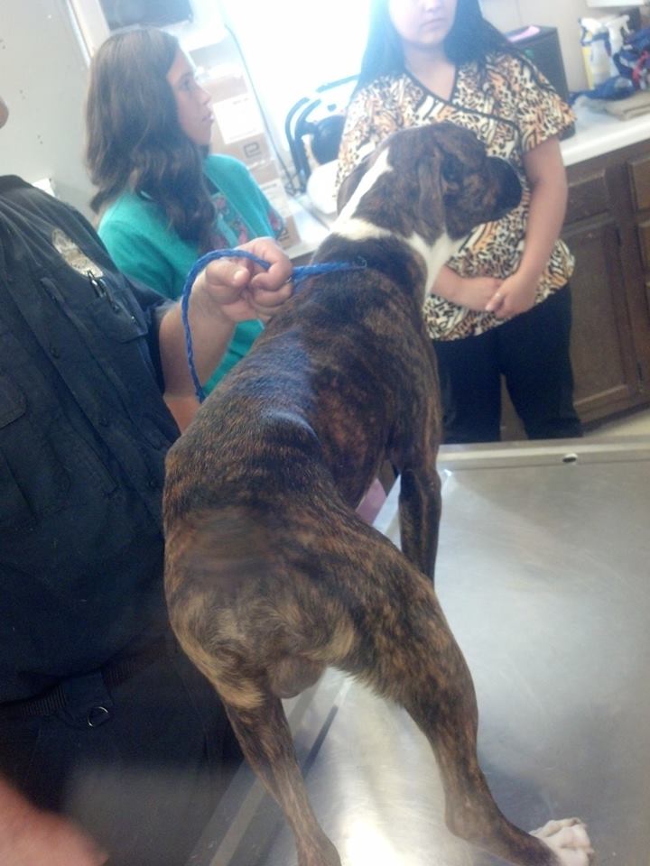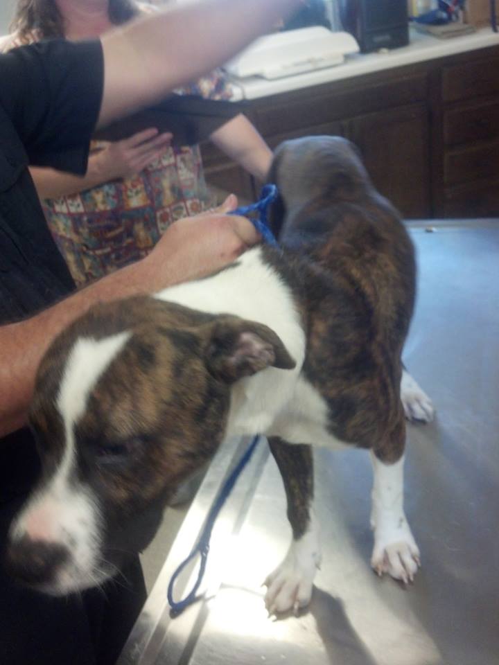 Forrest (named after Officer Forest): 1-2 years old, Brindle and White, unaltered male Pit Bull. Loaded with intestinal worms, HW negative, fleas, emaciated, weight 39lbs.