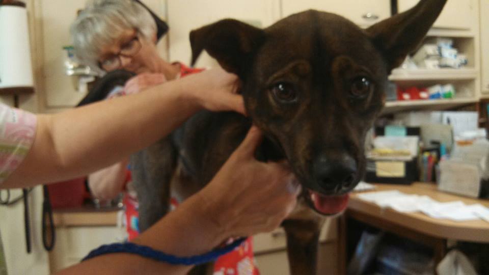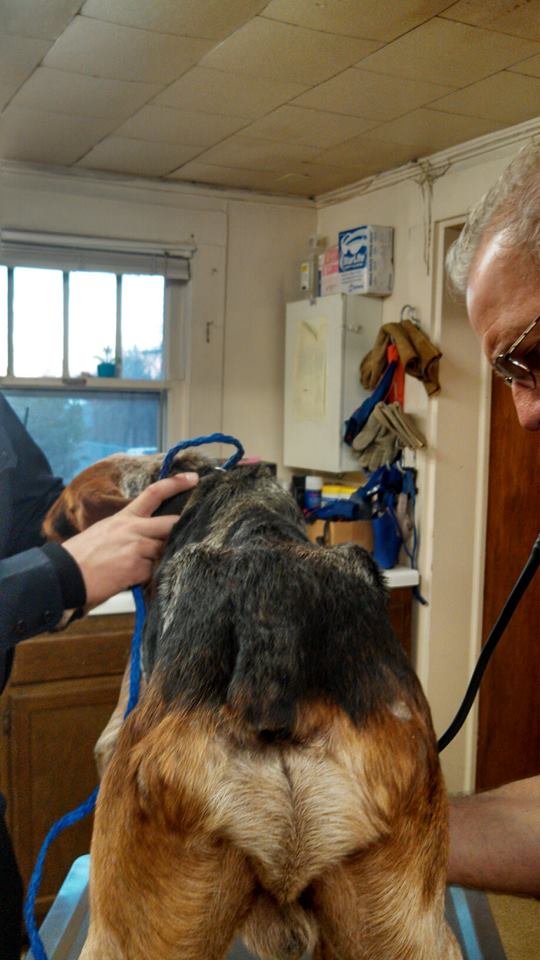 During the male dogs exam Dr. Hedrick noticed that his hind legs are slightly different lengths. He examed his pelvis and said he could feel a fracture in one of the bones and his pelvis was collapsed. He doesn’t think that surgery will be needed right now. It appears to be an old injury that was never properly treated so it healed wrong. Dr. Hedrick will know more once he does a few x-rays of the area.