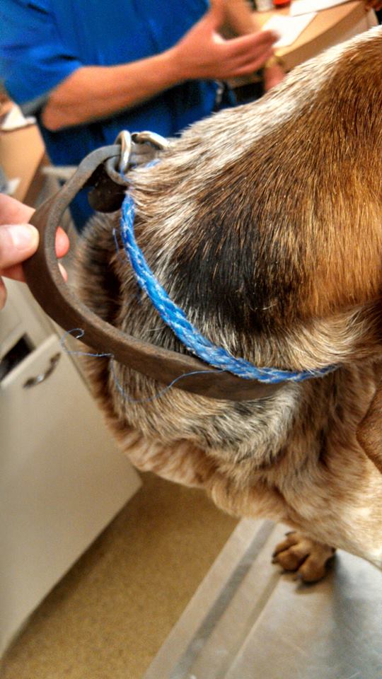 Sam was dehydrated and in desperate need of nourishment. Ellie (who is half his size) weighs 38 lbs and Sam weighed in at 37 lbs. Due to his large stature he should be closer to 60 lbs. You can see how big he once was based on the collar he had on.