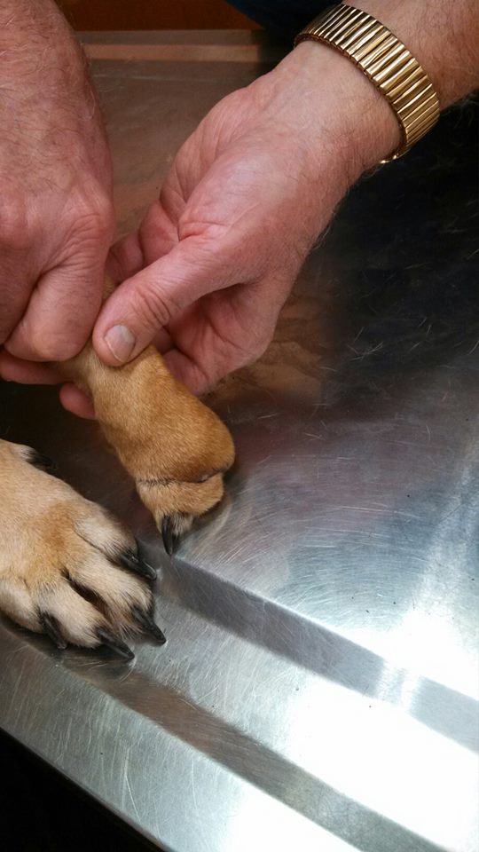 During her exam Dr. Hedrick pointed out the scar pattern on her paw and he knew exactly what happened…she had stepped into an animal trap (snap/foot trap). There is no telling how long this sweet girl was stuck in the trap but it was long enough to cut off the circulation to most of her paw causing it to rot it off. She has already completely healed leaving only the scar and one toe.