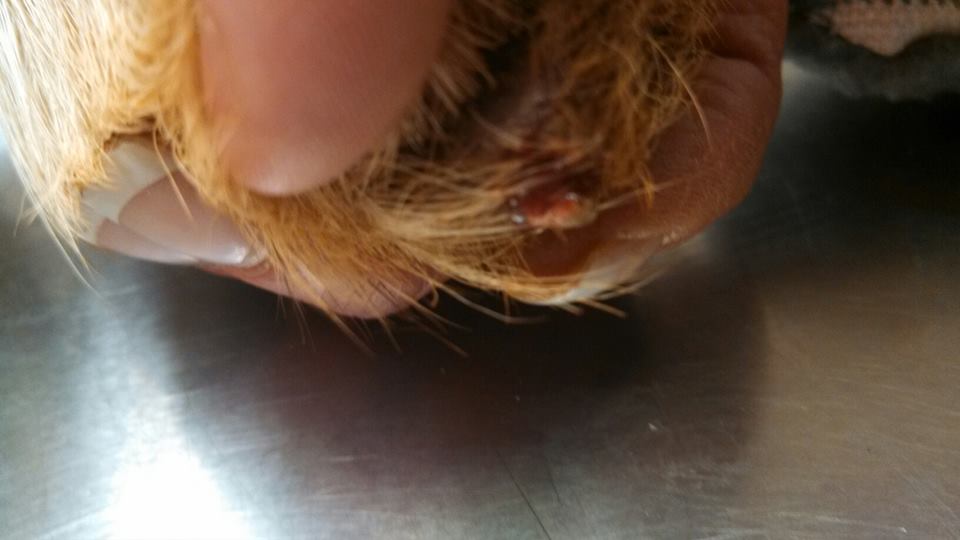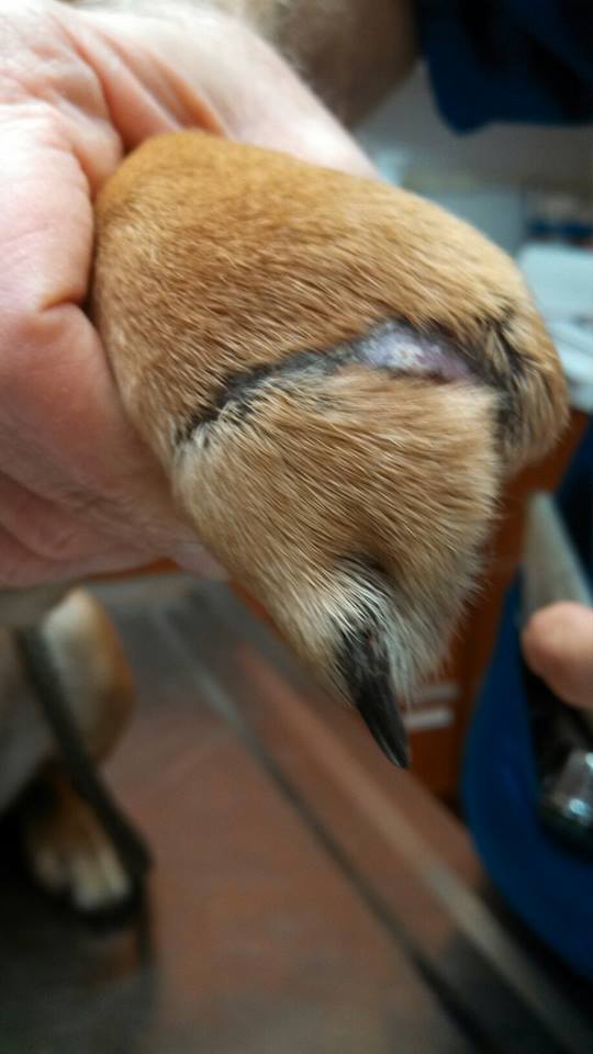 Her tail is a different story however. 2/3 of it is missing, the bone is exposed and it is infected. No-one knows for sure how this happened to her but it could have also been stuck in trap or it could have been cut off by god only knows who or what. It does appear like her tail injury happened after her paw injury but there is no way to know for sure.